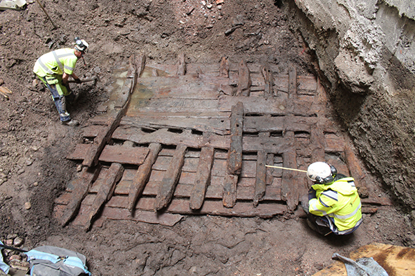 Bild: Undersökning av vraket i kvarteret Styrpinnen vid Kungsträdgården i Stockholm. Foto: Arkeologikonsult.
