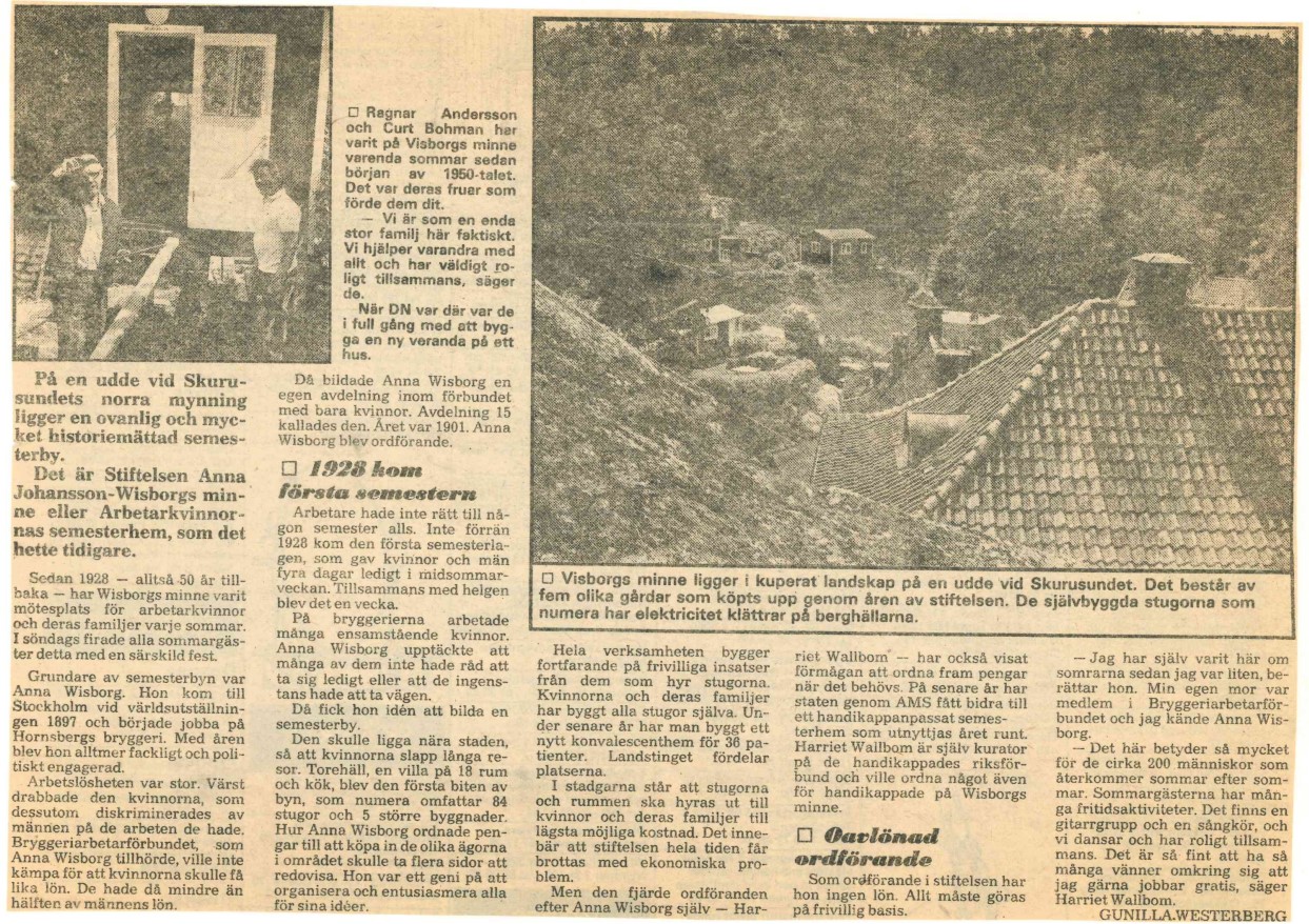 I tidningsartikeln kan vi läsa att semesterbyn består av enkla stugor som går att hyra några veckor på sommaren. Stugorna ligger vid Skurusundet i Nacka. Det är bara kvinnor med låg lön som får hyra dem. Det bestämde nämligen Anna Johansson-Visborg när hon lät bygga semesterbyn 1928.