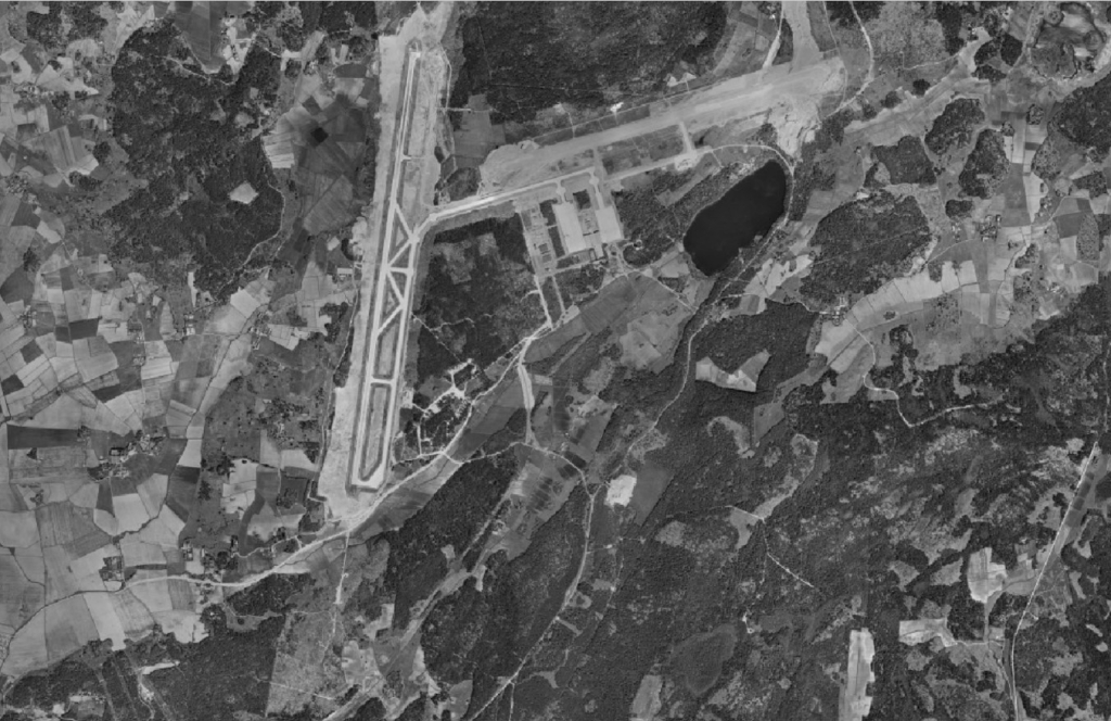 F2 år 1936 med permanenta hangarer andra byggnader. Hur många flygplan kan du räkna till?