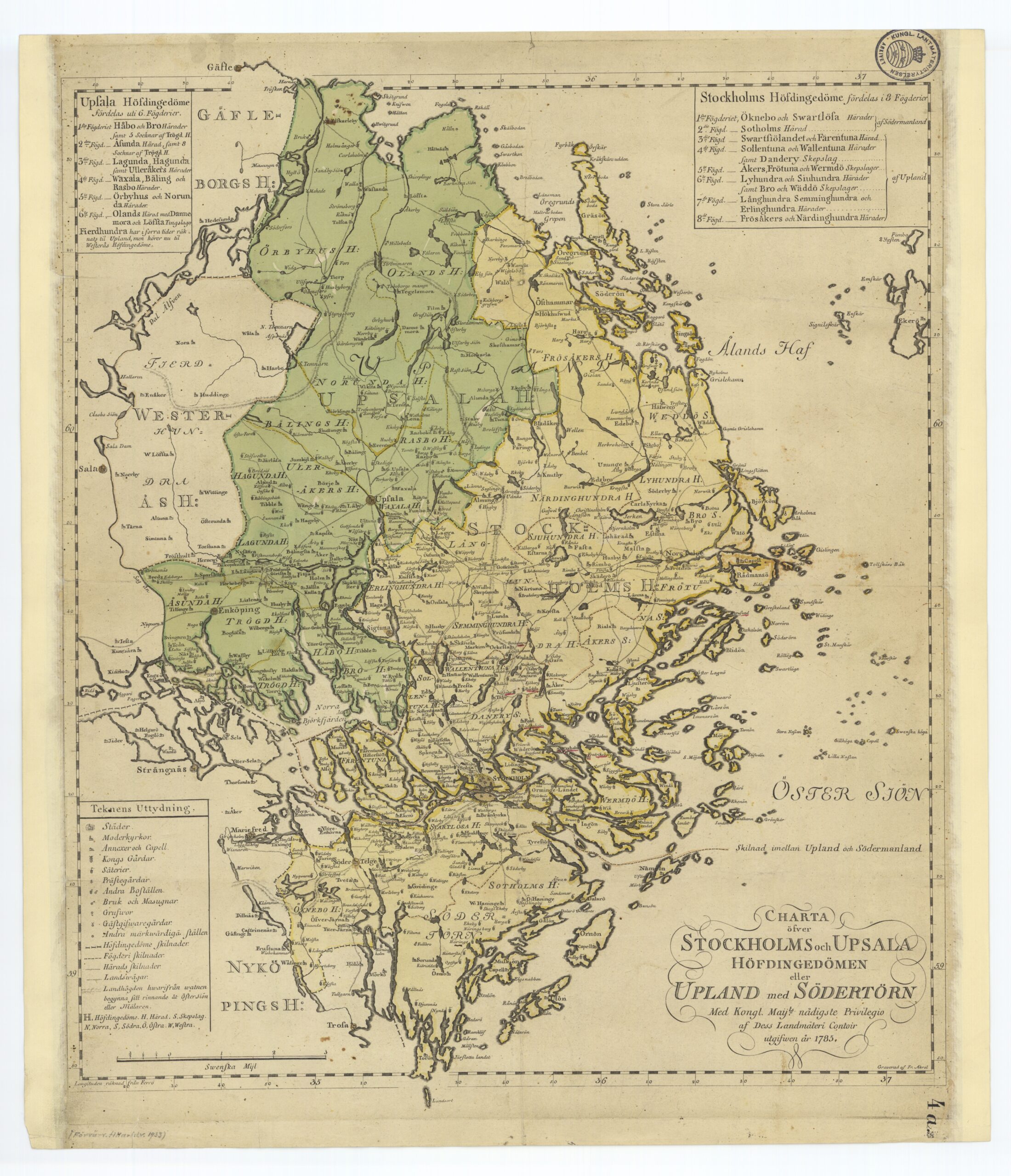 Karta från 1785 över Stockholm och Uppsala höfdingedömen, motsvarande dagen län.rnLantmäteristyrelsens arkiv.rn