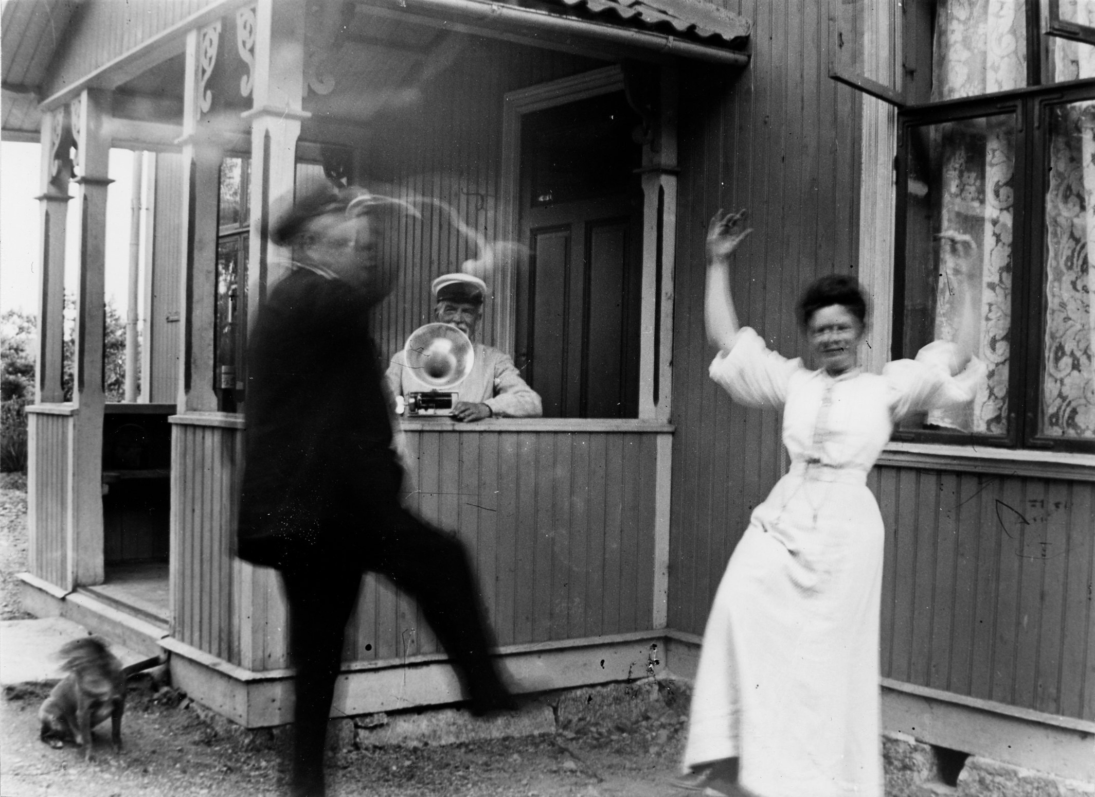 Ludvig Richnau spelar grammofon. De dansande personerna är troligtvis Richtenaus dotter och hennes man. Foto: Nanna Tingvall. Sigtuna museum.