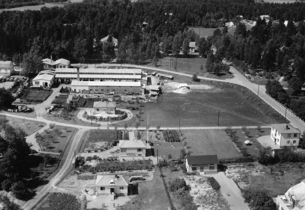 På den svartvita bilden från 1940 ser vi bryggor och hangarer på udden. Här höll Roslagens flygflottilj till med sina militärflygplan. Roslagsbanans spår gör en sväng längs viken. Där vid svängen ligger Hägernäs gård.