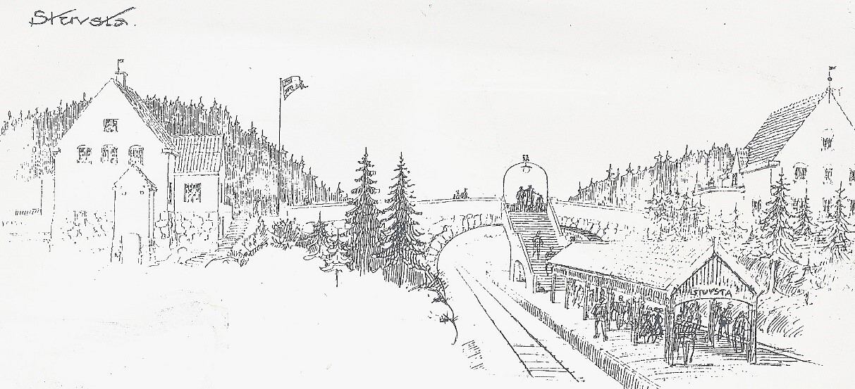Skiss som visar den planerade stationen i Stuvsta. Idén var att bygga ett likadant hus på andra sidan spåret men det blev för dyrt.