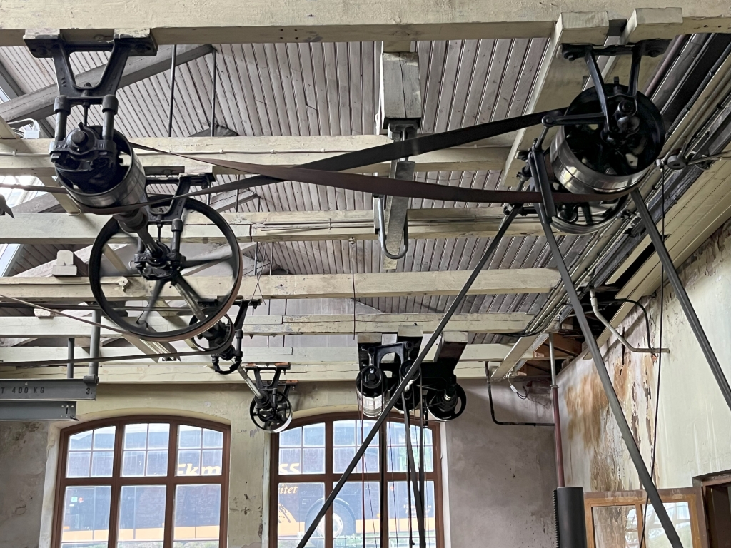 Svartvitt foto av en fabrikshall där män arbetar vid maskiner med drivremmar som går upp i taket.
