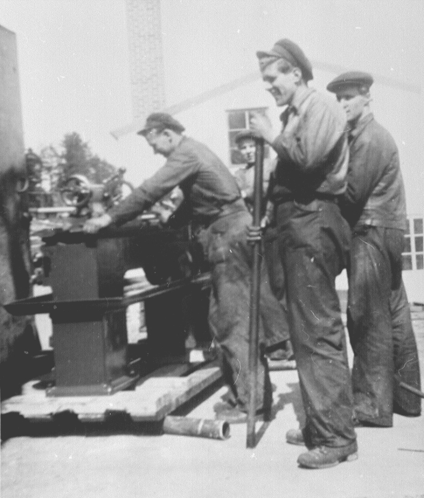 Sju män i skärmmössor arbetar vid olika maskiner i verkstaden.