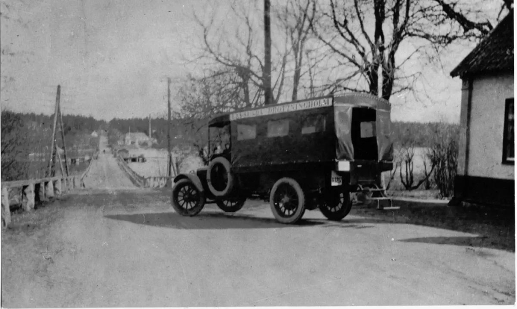 På bilden ser du en av de första bussarna som körde på Mälaröarna. Den väntar på att köra iväg från Träkvista mot Drottningholm, som du ser på skylten. Passagernarna klev på längst bak och satt på två långa bänkar. Tolv personer fick plats och det fanns inga säkerhetsbälten. Idag skulle vi kanske kalla det för en minibuss. De första bussarna var sådana här ombyggda bilar. Bilden är tagen på 1920-talet. Det var en brytningstid då bilar och bussar började ta över trafiken från båtar och hästskjutsar.