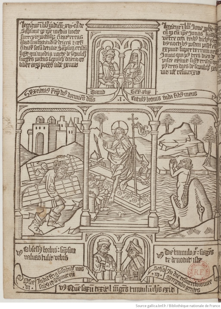Jona och valfisken från Biblia Paupenum, 1480 (Bibliothèque Nationale de France, département Réserve des livres rares, XYLO-5) och kalkmålning i Täby kyrka. Foto: Anna Ulfstrand